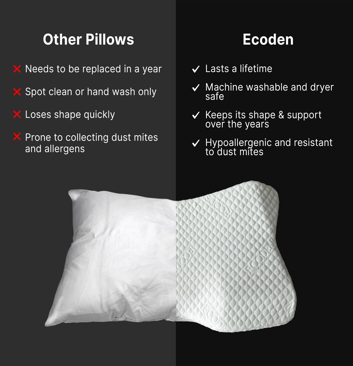 Always wake up refreshed and ready for the day. Tired of waking up with neck pain? Struggling with falling asleep and staying asleep all night? Craving the kind of sleep that leaves you energized? You’ll get it all with Ecoden’s Pillow of the Future—a revolutionary design that guarantees perfect alignment, adapts to every move, and relieves pressure at every turn.